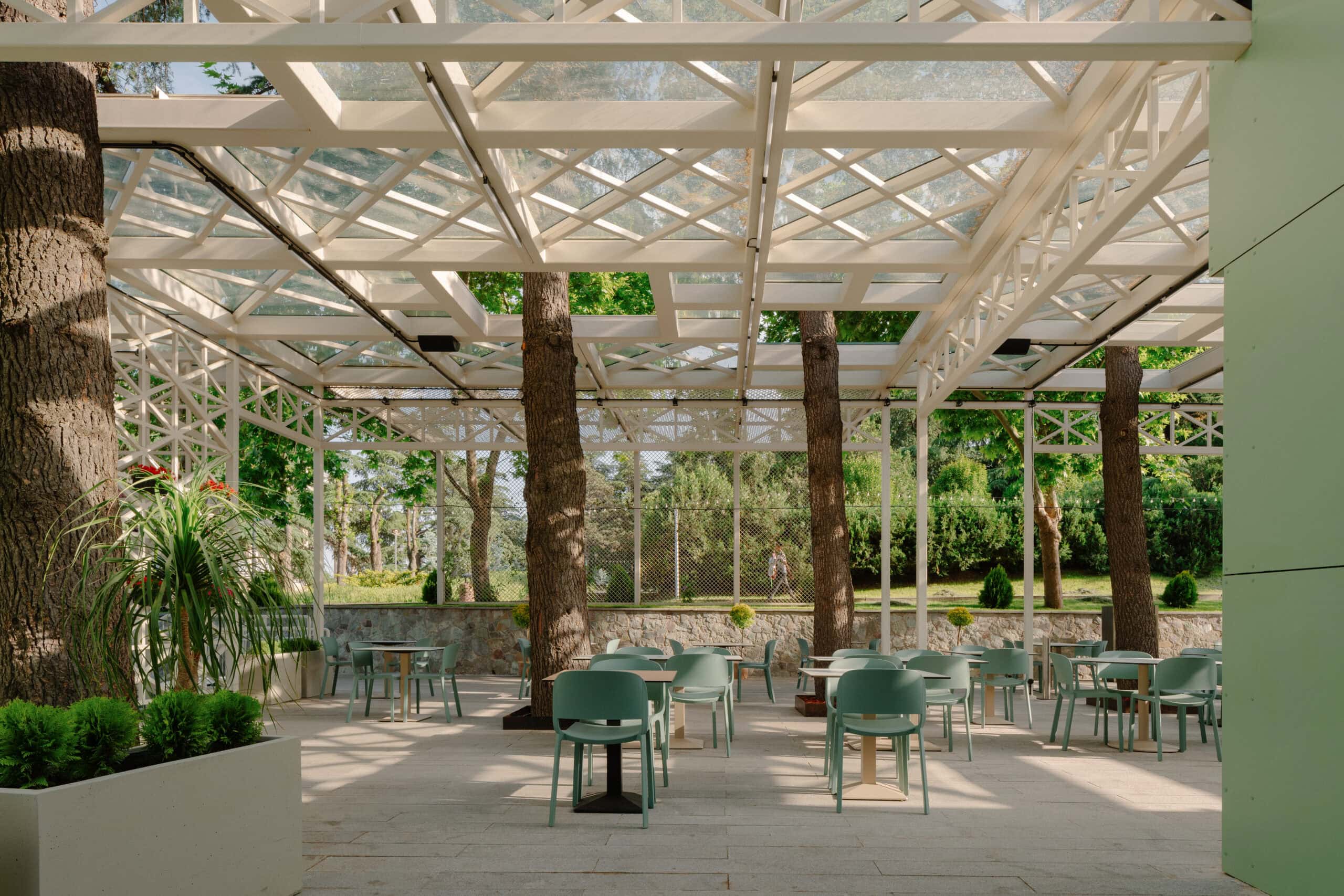 შენობა შედგება ალუმინის კონსტრუქციებისგან, ლამინირებული მინის ვიტრაჟებისა და მოძრავი პანელებისგან, რომლებიც ცვლის ფასადის იერს და ერწყმის პარკის გარემოს. არქიტექტურული ფორმა შთაგონებულია მთაწმინდის ისტორიული ფოტოებით – შორიდან ნაცნობი სილუეტი ახლოდან თანამედროვე დეტალებით გამოირჩევა.
