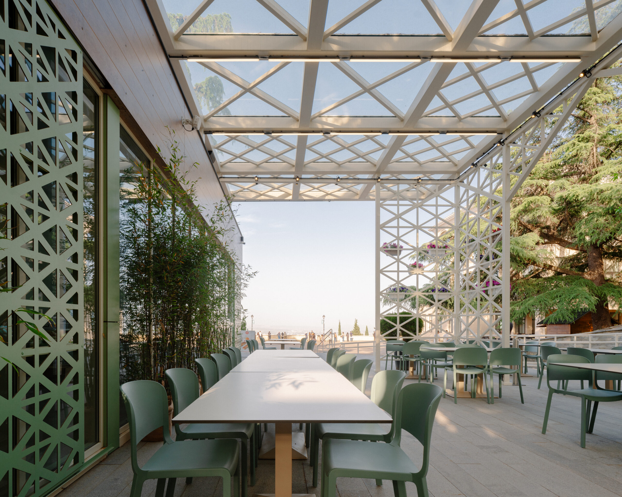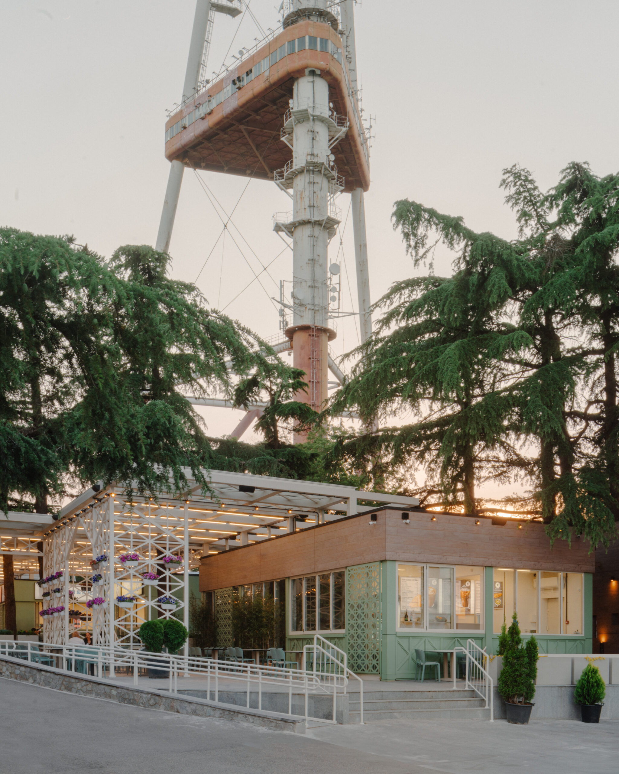 With a focus on creating an open and airy space, the design draws inspiration from historical images of Mtatsminda, while offering a modern interpretation. The building’s silhouette feels familiar from afar but surprises with contemporary details up close. Large glazing ensures an abundance of natural light, enhancing the overall transparency of the structure and maintaining a visual connection to the surrounding landscape.