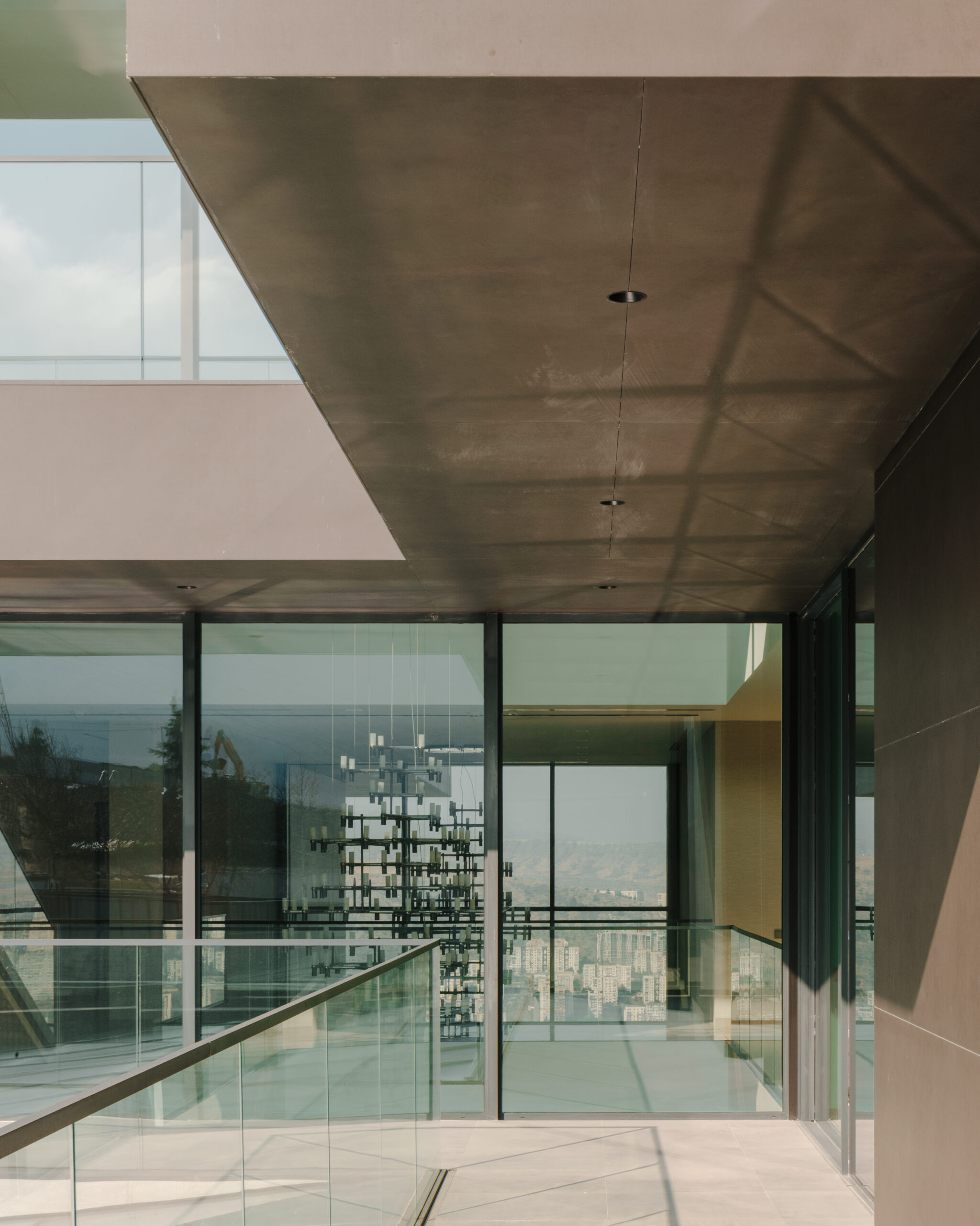 This private residence was designed on a gently sloped 2129 m² plot located in the Kaklebi area of Tbilisi, Georgia. The brief called for a spacious family home that maximizes privacy and spatial flow despite the absence of panoramic views. To meet this challenge, the project centers around a private courtyard with a swimming pool, around which all interior spaces are oriented.
