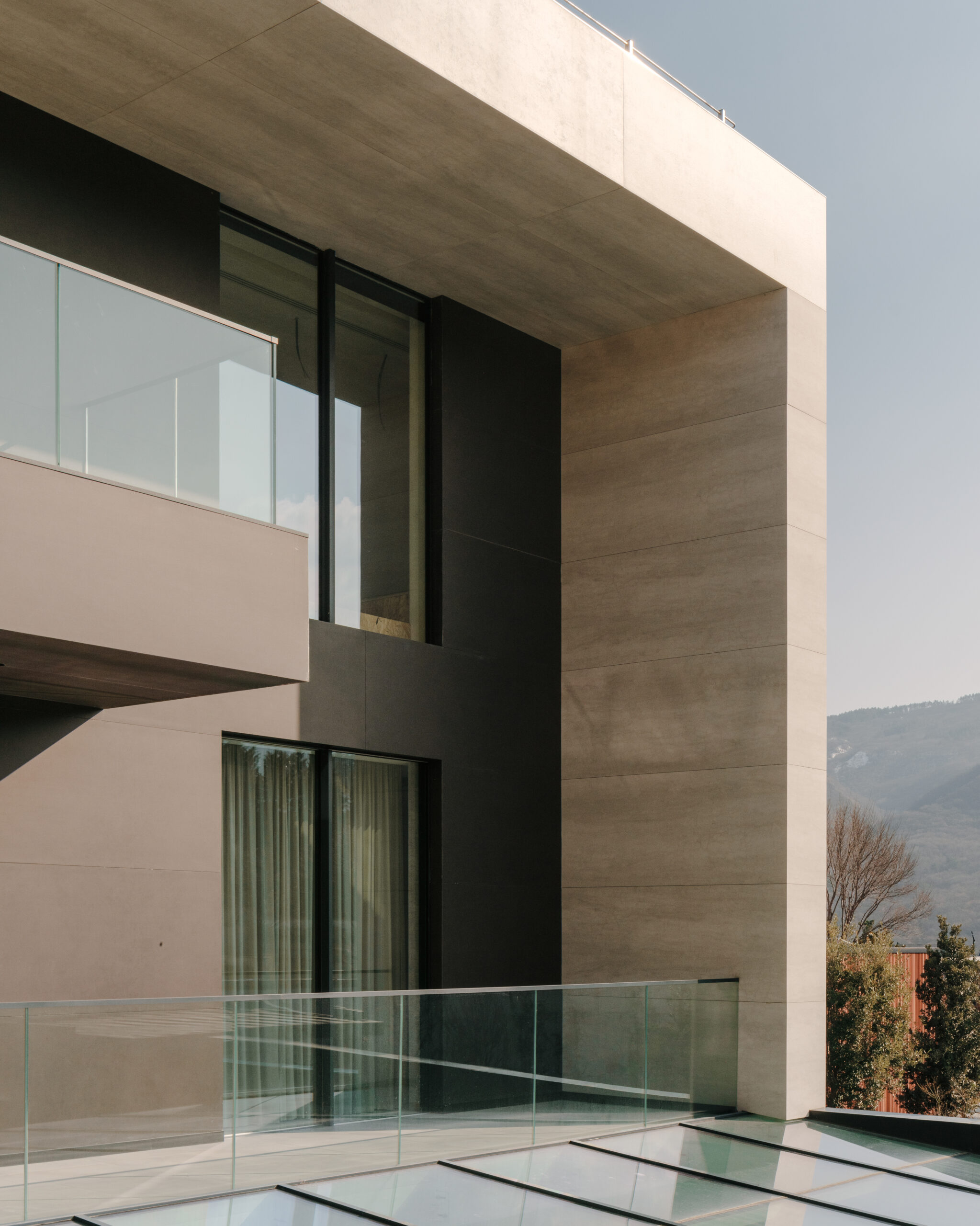 The house is a four-story single-family residence with one underground and three above-ground levels. The main structural system consists of a reinforced concrete frame filled with construction-grade blocks. Exterior materials include natural stone cladding, cement render with facade paint, and tempered glass elements for railings. The roof is a flat slab with a slight slope. Large-format glazing in dark grey aluminum frames ensures natural light throughout the home.